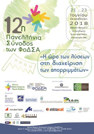 Το τριήμερο 21-23 Ιουνίου πραγματοποιήθηκε με επιτυχία η 12η Πανελλήνια Σύνοδος των ΦΟΔΣΑ, η οποία υλοποιήθηκε από το Δίκτυο των Φορέων Διαχείρισης Στερεών Αποβλήτων (Δίκτυο ΦΟΔΣΑ) και τον Περιφερειακό Σύνδεσμο Φορέων Διαχείρισης Στερεών Αποβλήτων Κεντρικής Μακεδονίας.