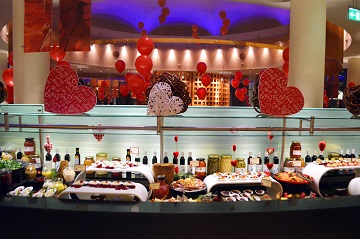 Στις 14 Φεβρουαρίου, ο εντυπωσιακός μπουφές του Βυζαντινού υποδέχεται τους ερωτευμένους με πλήθος γευστικών προτάσεων, όπως στρείδια, γαρίδες με κάρυ, σούσι, αλλά και Rib-Eye με τα συνοδευτικά του, ραβιόλι από παντζάρι με γέμιση καβούρι, σολομό με σος chardonnay, μοσχαρίσια ταλιάτα, ζυμαρικά Alfredo που ετοιμάζονται μπροστά σας. Ο μπουφές γλυκών επιφυλάσσει λαχταριστές εκπλήξεις: τρούφες, μακαρόν, μους σοκολάτας με φρούτα του πάθους, κέικ red velvet, μαρέγκες με βατόμουρα και σιντριβάνι σοκολάτας για να γαρνίρετε φρέσκα φρούτα και ζαχαρωτά! Αν πάλι προτιμάτε set μενού με θέα στην Ακρόπολη, κάνετε κράτηση στο Galaxy Private Room, την αίθουσα δεξιώσεων που βρίσκεται ακριβώς δίπλα στο Galaxy Bar, και απολαύστε την ιεροτελεστία ενός ολοκληρωμένου gourmet δείπνου 6 πιάτων και μάλιστα με το ανάλογο wine pairing, ατενίζοντας τη φωτισμένη Αθήνα.