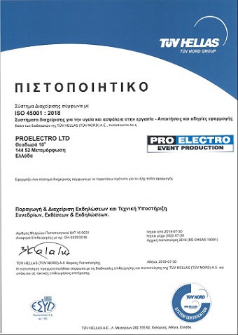 Στο πλαίσιο αυτό έχει πιστοποιηθεί από το μεγαλύτερο διαπιστευμένο Φορέα Πιστοποίησης στην Ελλάδα, την TÜV Hellas (TÜV NORD) A.E., σύμφωνα με τις απαιτήσεις των ανωτέρω προτύπου εντός του 2019 για το πεδίο εφαρμογής: «Παραγωγή & Διαχείριση Εκδηλώσεων και Τεχνική Υποστήριξη Συνεδρίων, Εκθέσεων & Εκδηλώσεων». Η Εταιρία είχε αρχικά πιστοποιηθεί σύμφωνα με τις απαιτήσεις του προτύπου OHSAS 18001:2007 από το 2016 και συνεχίζει, αποσκοπώντας στην εκτέλεση όλων των εργασιών με τις καλύτερες απαιτήσεις σε ποιότητα και χρόνο, χωρίς ατύχημα ή περιστατικό που θα βλάψει την ανθρώπινη υγεία ή/ και το περιβάλλον.